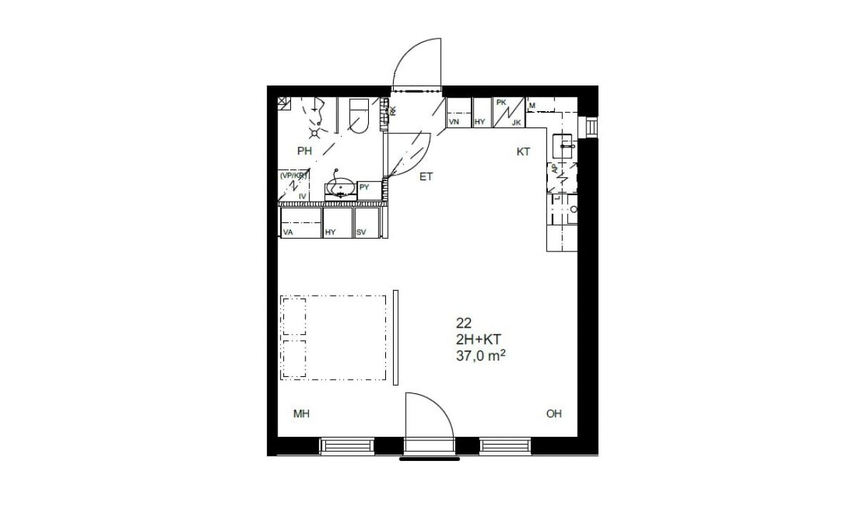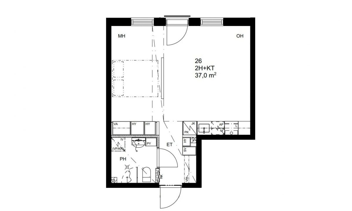 Koneellinen ilmanvaihto, vesikiertoinen lattialämmitys kaukolämmöllä – huomaa isot ikkunat, jotka ovat miltei lattianrajaan saakka!